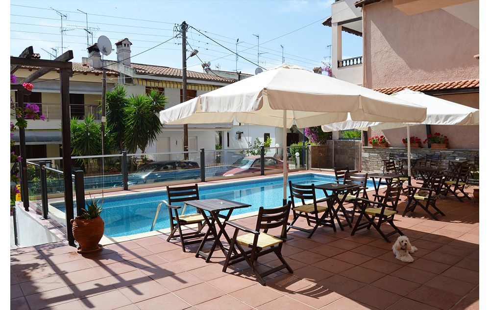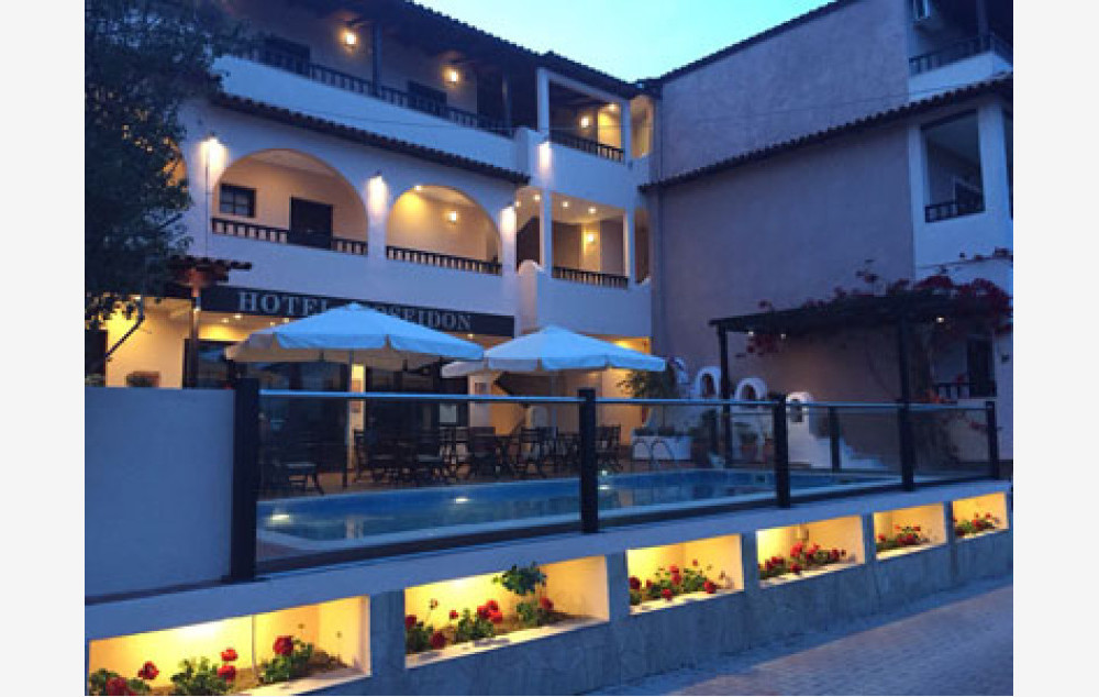 Poseidon, lep mali hotel, apartmanskog tipa, nalazi se u neposrednoj blizini centra, na oko 70 metara od plaže u najlepšem i najluksuznijem delu Pefkohorija. Ima mali bazen (zatvoren u periodu popodnevnog odmora, bez ležaljki) okružen stolovima/stolicama i suncobranima. Vila nema sopstveni parking, preporuka za aranžmane sa autobuskim prevozom.