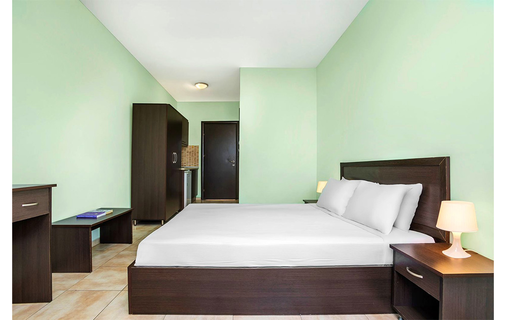 Dvokrevetni, prostrani studiji (1/2 STD) sadrže opremljenu kuhinju, deo za spavanje sa francuskim ležajem i kupatilo.