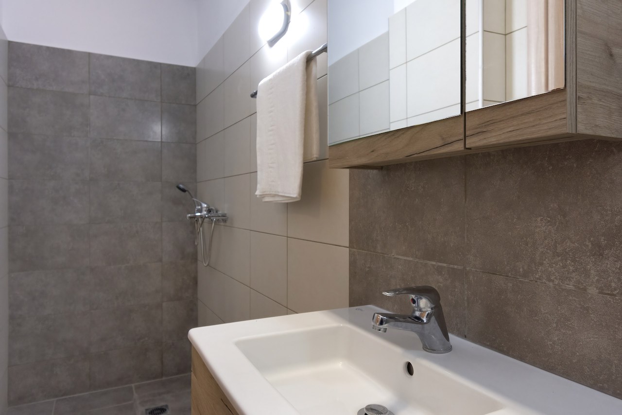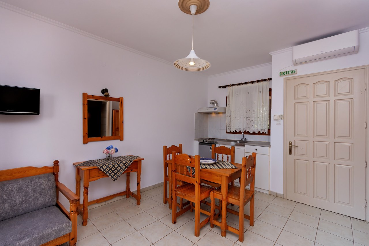TROKREVETNI APARTMAN: Trokrevetni apartman se sastoji iz spavaće sobe koja u svom sastavu poseduje dva singl ležaja dimenzija 90x190cm kao sofa krevet dimenzija 190x80cm (takođe u pojedinim apartmanima treći ležaj može biti u sklopu kuhinjskog dela, dok se onda u spavaćoj sobi mogu nalaziti 2 singl lezaja), dva noćna stočića sa dve lampe, klima uređaj, TV, i ima izlaz na terasu, koja poseduje sto sa tri stolice. Druga prostorija je kuhinja sa trpezarijom u kojoj se nalaze sto sa tri stolice za ručavanje, dok je u sastavu kuhinje rešo sa dve ringle, kao i neophodno posuđe za tri osobe. Kupatilo se sastoji od tuš kabine manjih dimenzija. Usluga WI-FI internet konekcije je besplatna.