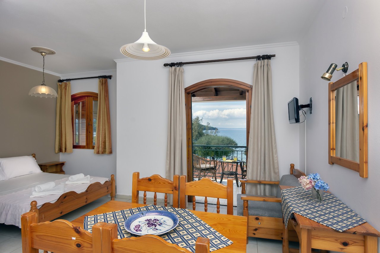 Trokrevetni apartmani se nalaze na prvom spratu ove lepe vile i imaju direktan pogled na more i luku. Apartmani se sastoje od spavaće sobe u kojoj se nalazi francuski krevet, ormar i noćni stočić, i dnevnog boravka gde se nalazi velika kuhinja koja u svom sastavu ima šporet sa 4 ringle i rernom, aspirator, pripadajuće posuđe za tri osobe, sto za ručavanje. Takođe u dnevnom boravku je krevet na rasklapanje za jednu osobu, klima uređaj i TV sa lokalnim kanalima. Kupatila su moderna i imaju tuš kabinu. Prelepa velika terasa sa koje se pruža neverovatan pogled na more i luku u svom sastavu ima sto sa tri stolice.