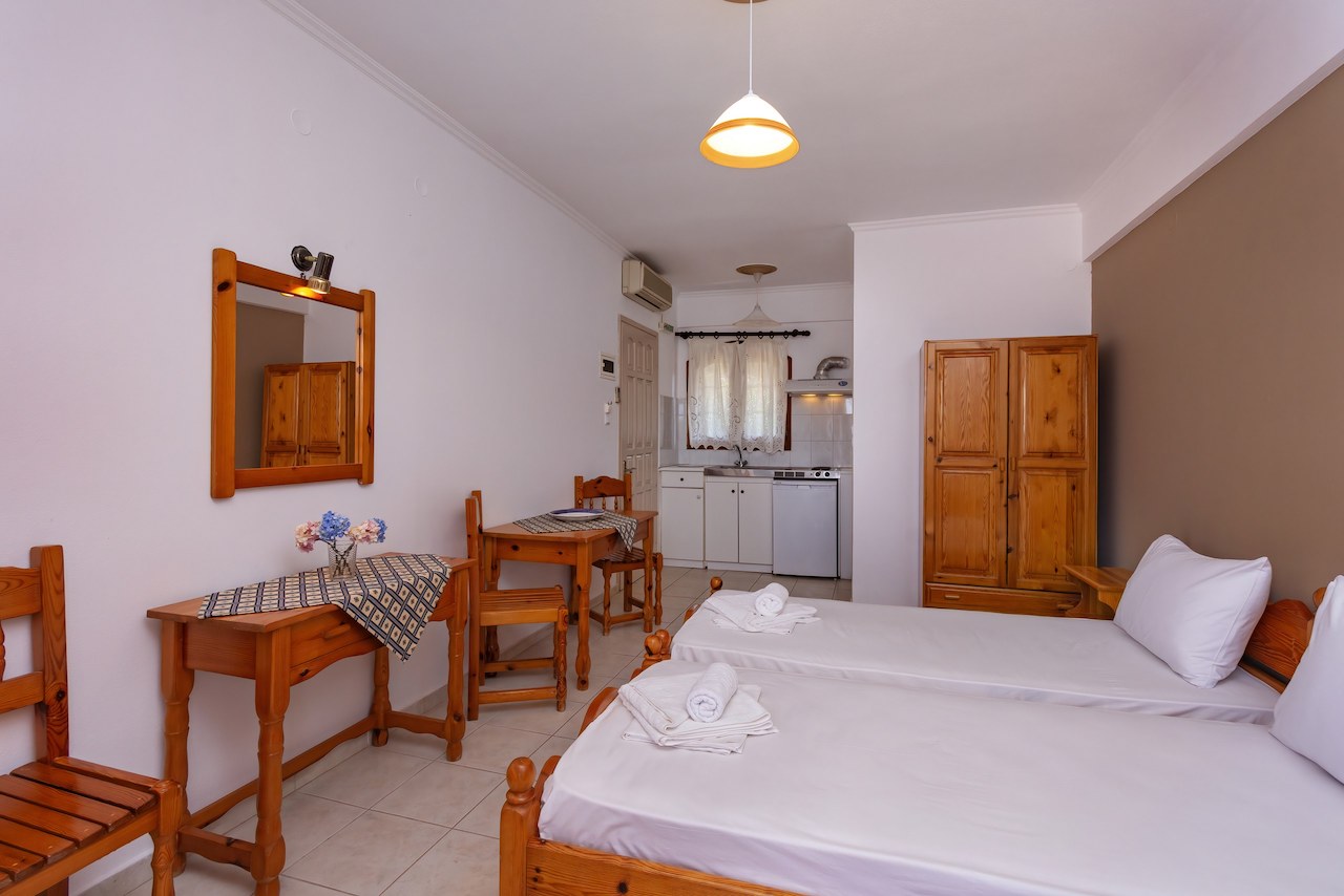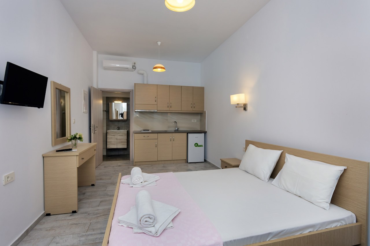 DVOKREVETNI STUDIJI: Dvokrevetni studiji se sastoje iz prostorije u kojoj se nalaze dva singl standardna ležaja dimenzija 90x190cm, dva noćna stočića, ormar, dve lampe, TV, klima uređaj, Kuhinja se nalazi u sklopu studija i od opreme poseduje rešo sa dve ringle, sudoperu, kao i neophodan kuhinjski pribor za dve osobe. Kupatilo u svom sastavu ima tuš kabinu , kao i po jedan veliki i jedan mali peškir po gostu. Terasa je komforna, i poseduje sto sa dve stolice. Usluga WI-FI internet konekcije je besplatna.